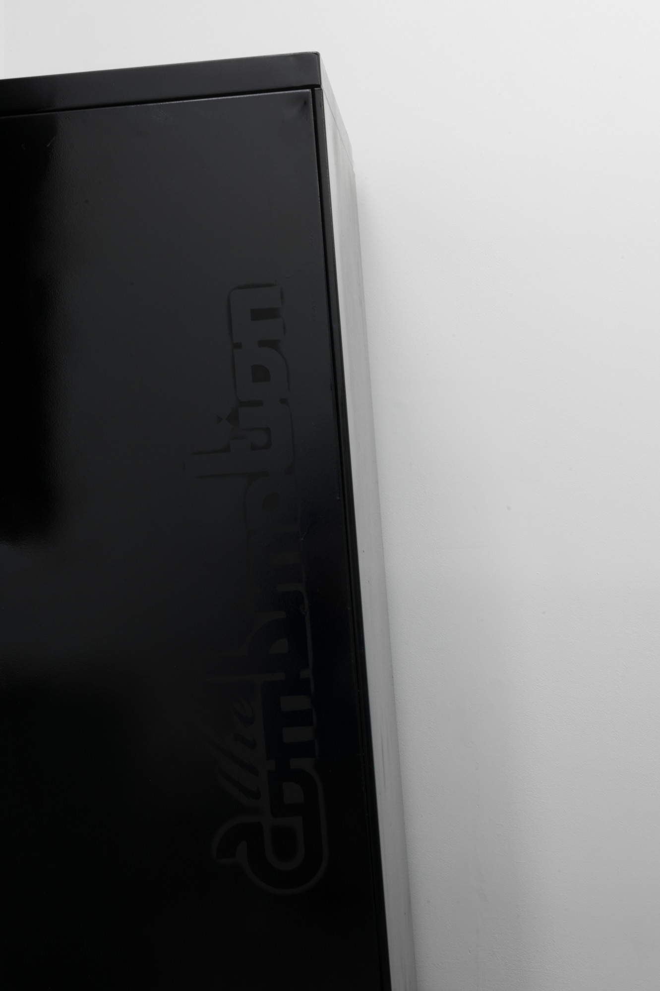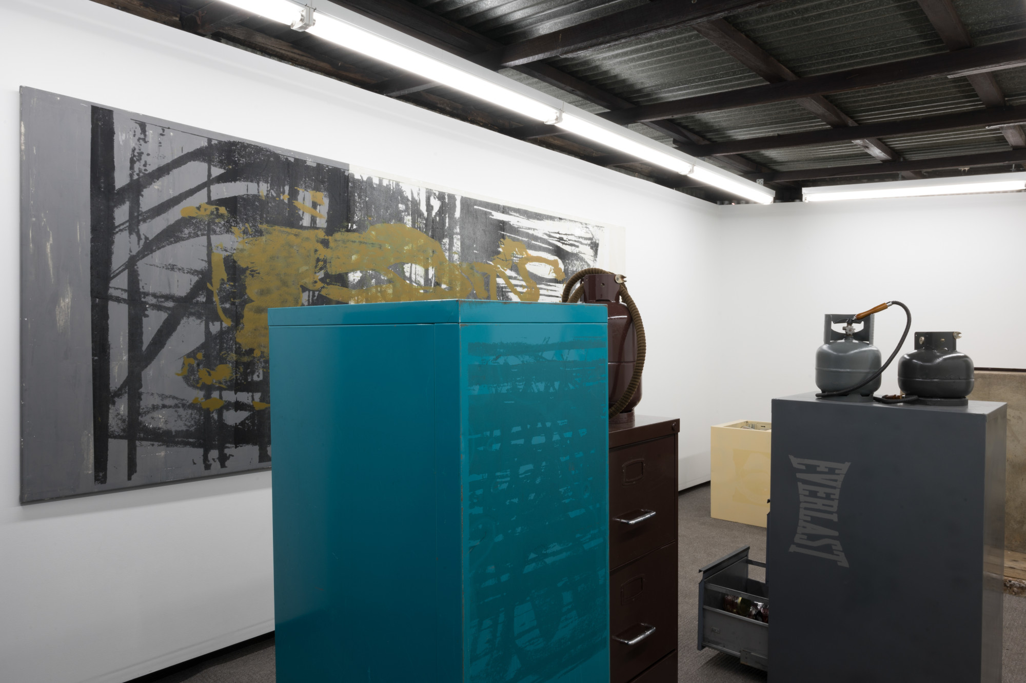 Acrylic with screen-print paste on filing cabinet, gas canister, arguileh hose, unidentified documents