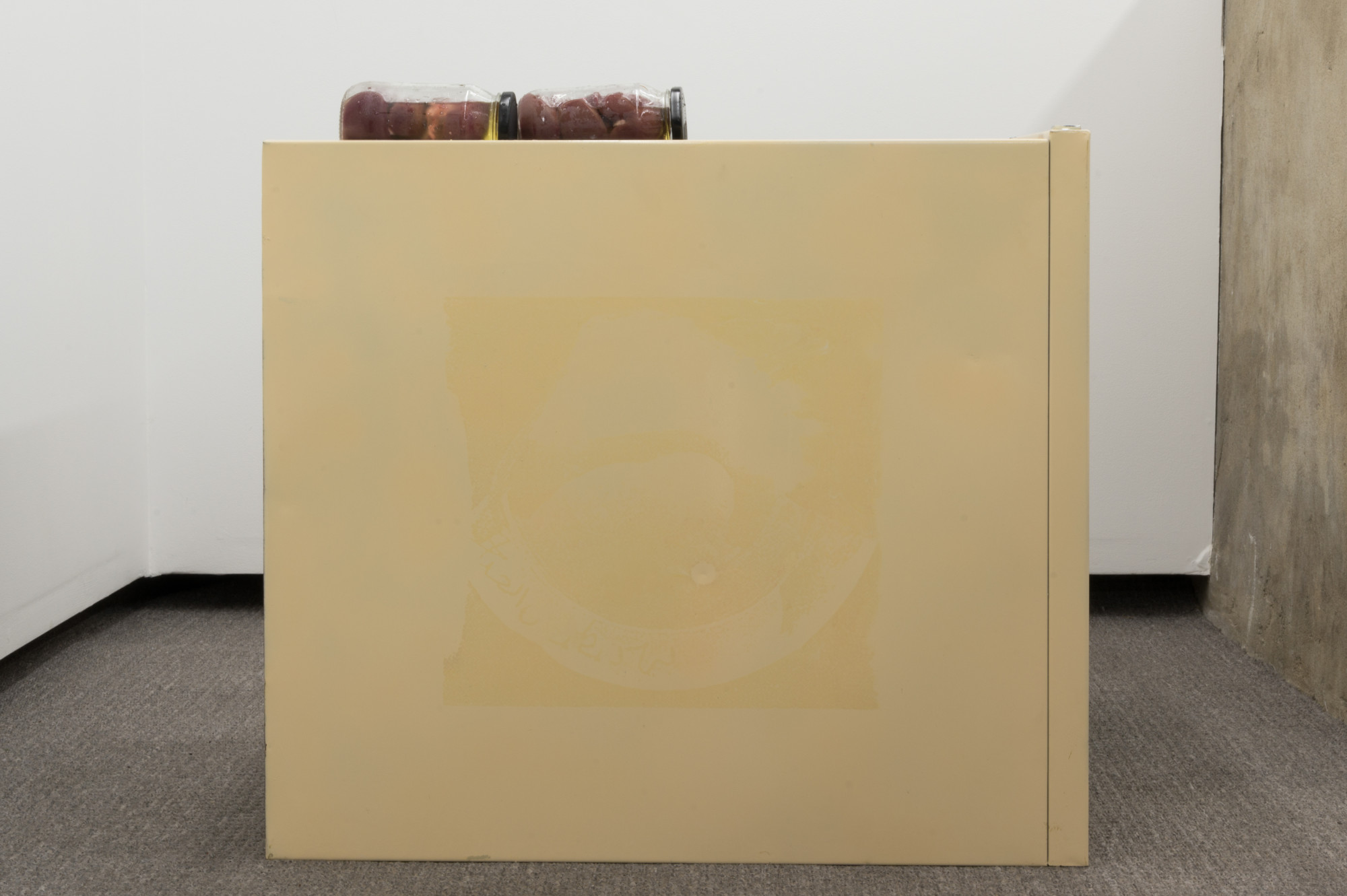 Acrylic with screen-print paste on filing cabinet, gas canister, glass jars, lamb liver, lamb kidney, vinegar, seed oil