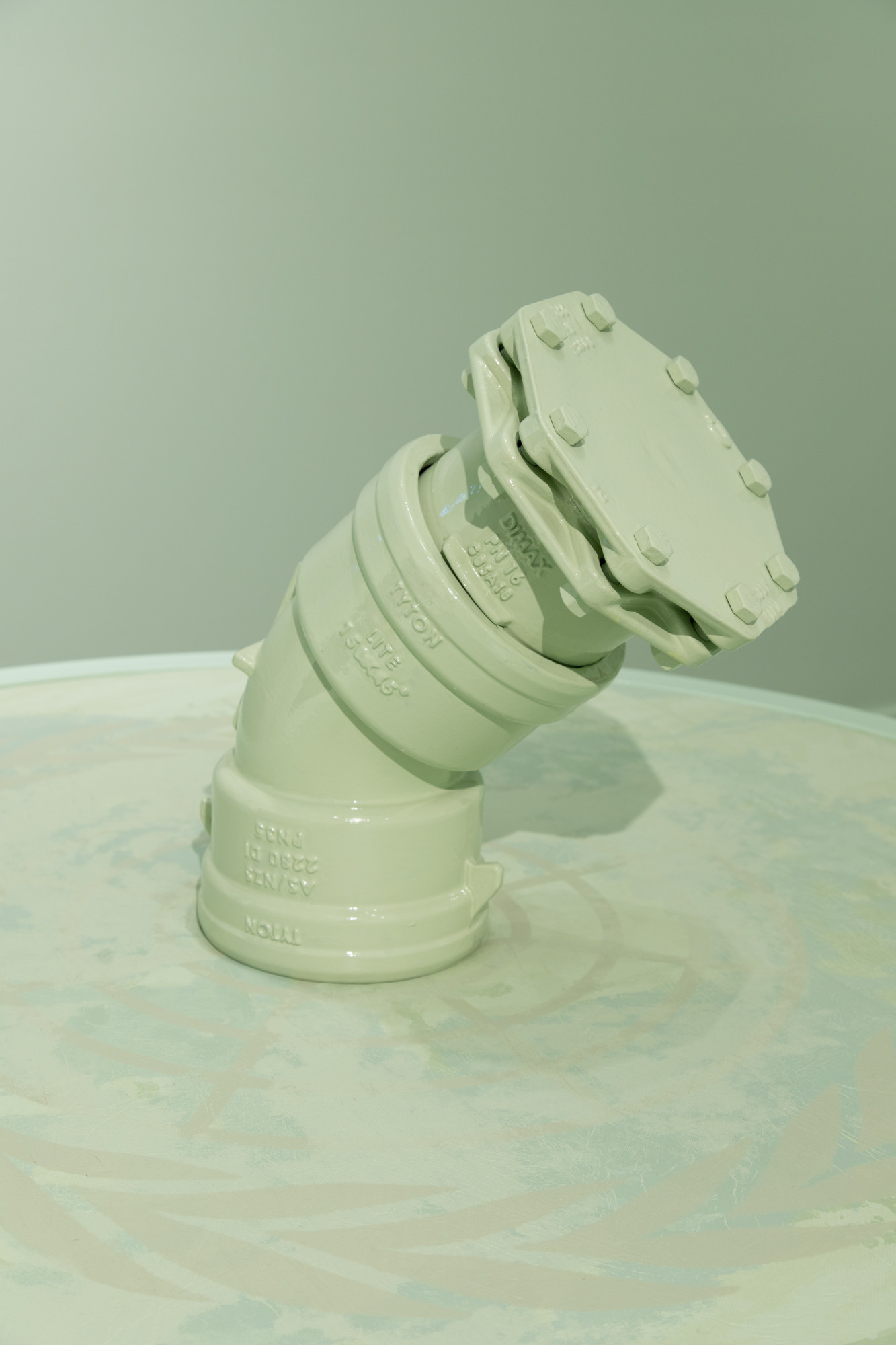 Crucially, Peters’ use of elements like pipes can be read through the lens of Fred Moten and Stefano Harney’s interpretation of “logistics.” In The Undercommons: Fugitive Planning & Black Study3, Moten and Harney articulate logistics not merely as the science of efficient movement and organisation of goods, but as a fundamental structure of control and containment within capitalist and colonial systems. These pipelines, seemingly functional and aesthetically integrated into Peters’ installations, can be seen as material manifestations of these unseen networks of power. They evoke the arteries of global capitalism, the pathways through which resources and bodies are channelled and often controlled, mirroring the radical capitalism and colonialism associated with logistical networks.