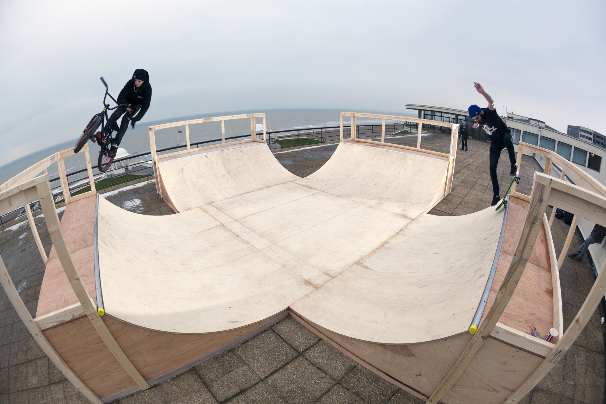 Plywood mini-ramp, steel coping, scaffold, lights, sound system