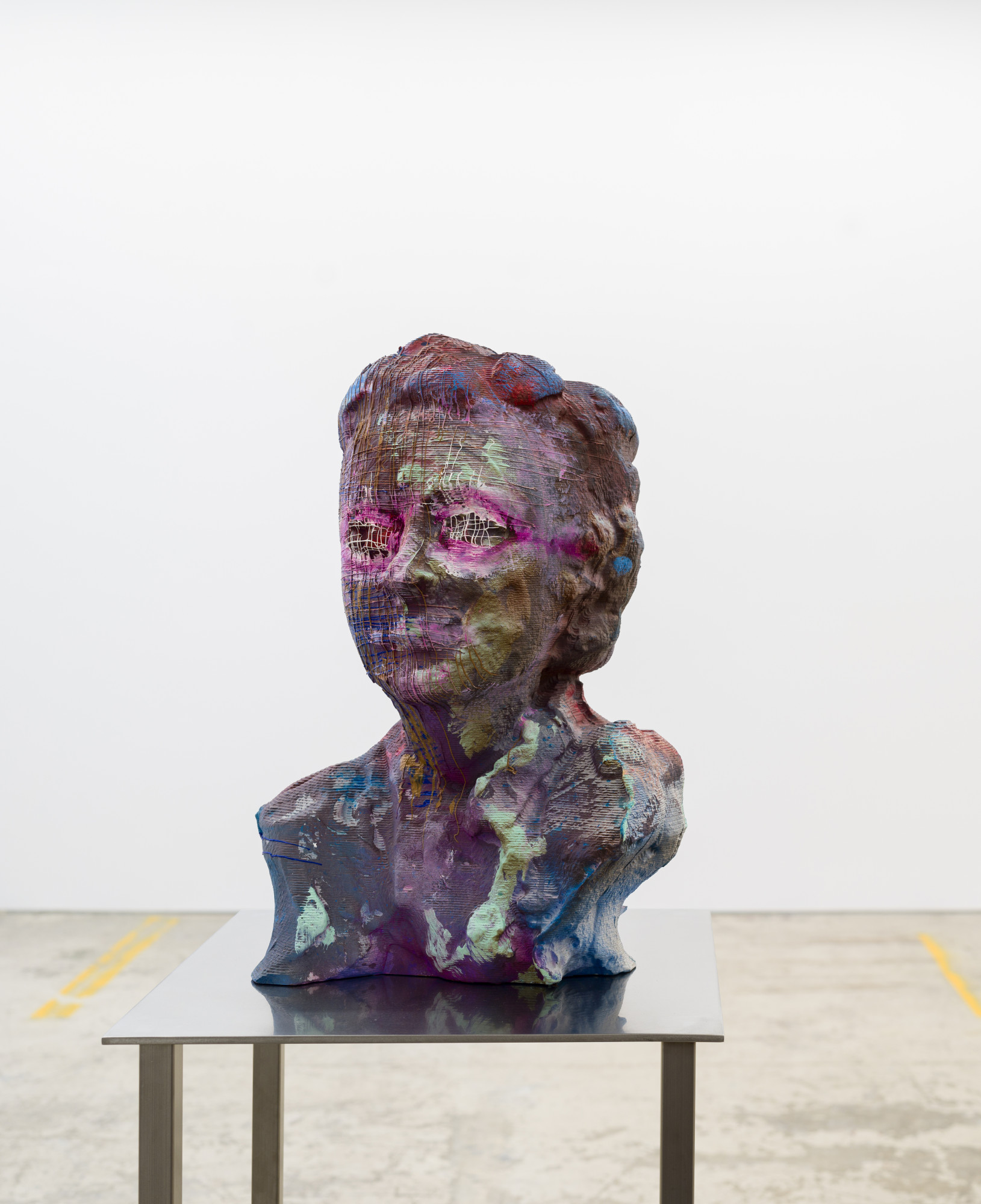 Kaari Upson’s bust sculptures stand as reminders of how slippage and mirroring prevail in the brand of matriarchy that defines the artist’s world. Upson attempted to sculpt her mother’s face from memory and extended the series through several generations of familial women. Each is cast, enlarged, and thickly painted by Upson to reflect the face of her mother, grandmother, or self, or that of her friend, friend’s mother, or grandmother — their faces are then pressed into each other so that the paint smudges and melds, presenting ambiguous, unreliable portraits, each a multiplication of the “her” that weaves through the artist’s practice at large.