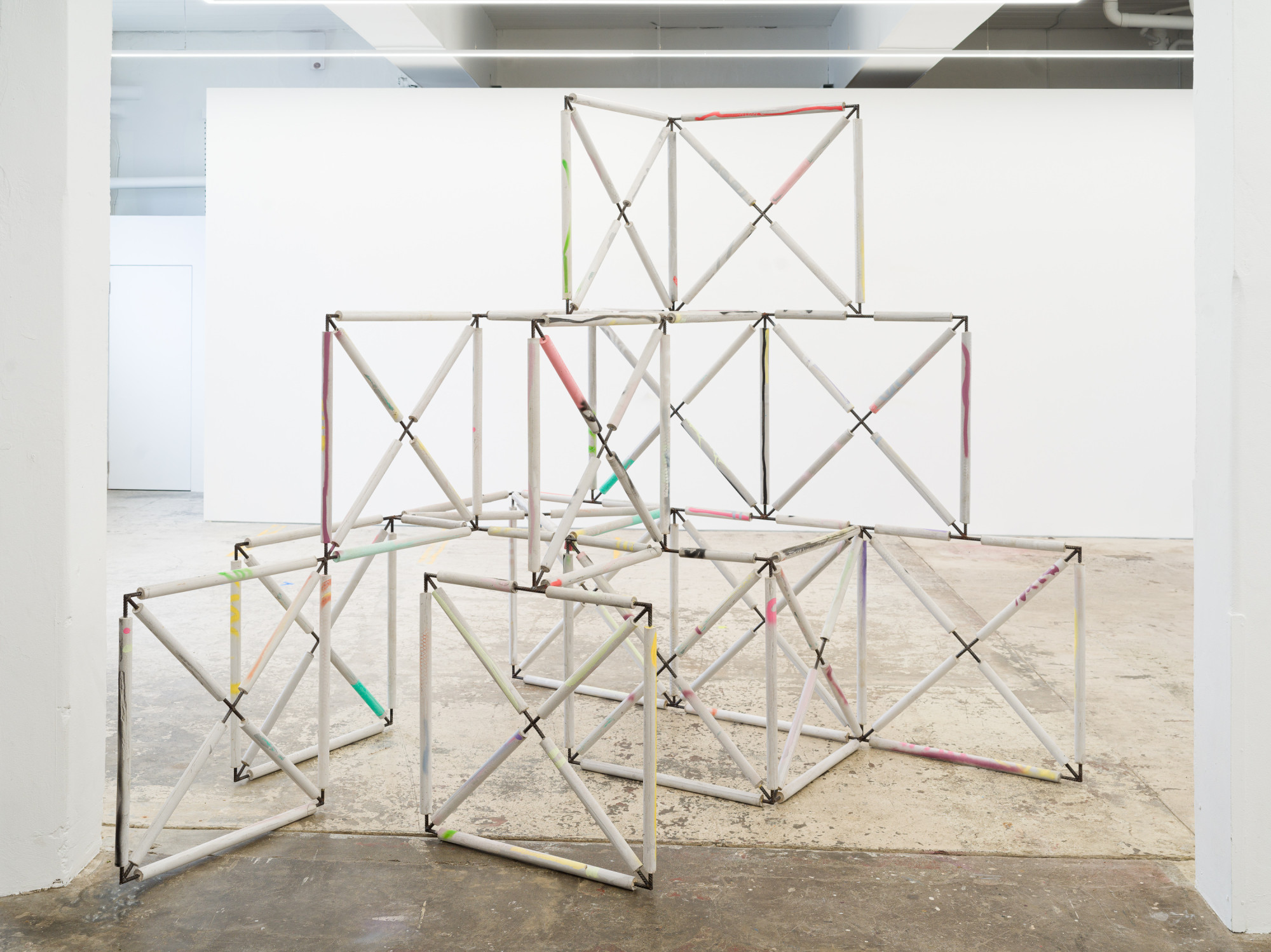 Tribute (2024) emerged from experiments with casting concrete around steel rebar squares, initially flat but naturally progressing to three-dimensional forms. Modularity is a consistent interest that runs throughout Eva’s practice, with sculptures that accumulate rather than exist as singular, complete entities. This sculpture was informed by a playground Rothschild made in east London and the familiar geometry of the pyramids — forms both fundamental and mystical, historically significant yet often abandoned. Eva’s work draws parallels between contemporary structures and ancient ruins, evoking a sense of the incomplete or the forgotten, of architecture that has moved beyond use. The works suggest a possibility for addition or subtraction. They are episodic and open-ended suggesting that change is always possible.
