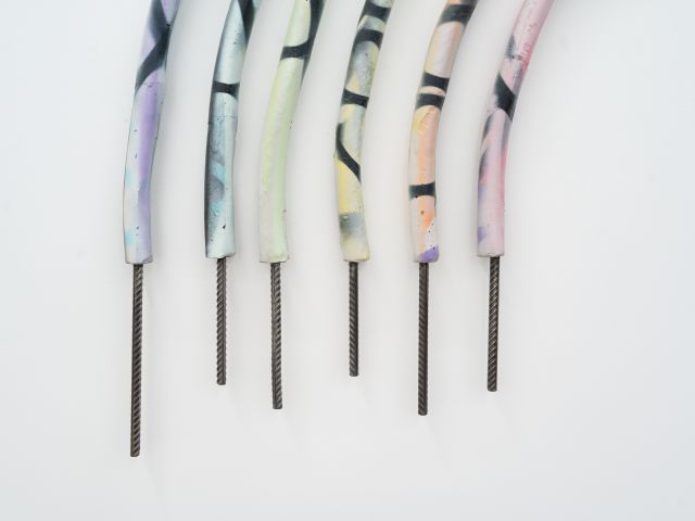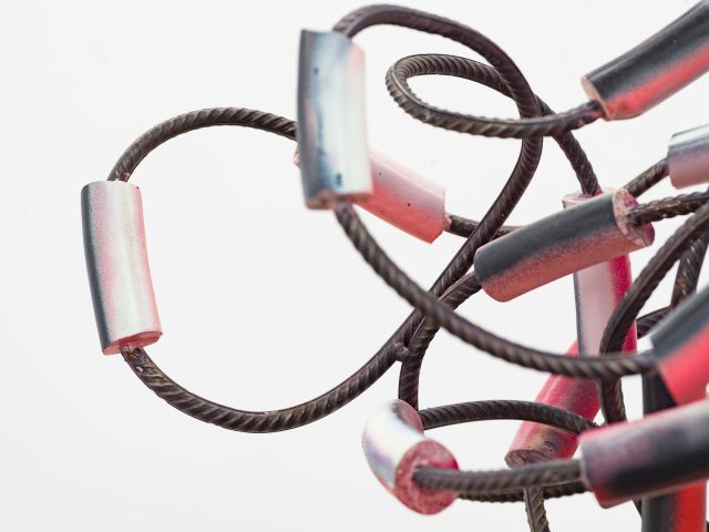 Introvert (2024) is one of several works in a series that challenge the inherent nature of materials, particularly steel rebar. The process and resulting work is paradoxical: a rigid, structural material is transformed into something light, tangled and seemingly malleable. The works can be placed at any height or orientation and hover on the edge of organised chaos.