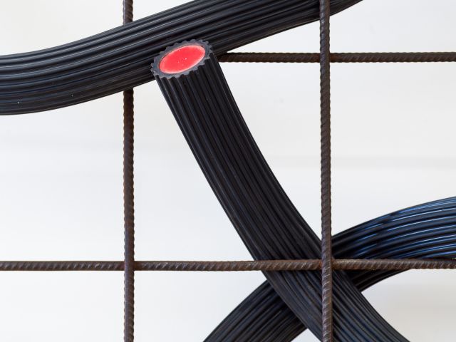 Influenced by the recent commission of two enormous tapestries for Sadler’s Wells East in London, Tapestry (2024) reinterprets traditional weaving on an entirely different scale, using unconventional materials that challenge expectations. While soft fibres typically define tapestry, Eva sought a more substantial alternative, turning to steel grids and extruded rubber as a readymade warp and weft to transform an industrial framework into woven sculpture.