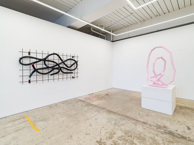 Eva Rothschild is a sculptor. Central to her work is in-depth material experimentation in the studio, and her work exists on every scale from the intimate to the monumental. Her work references history, such as the art movements of the 1960s and 1970s and the ancient world but is also informed by contemporary aesthetics. For example, the ‘love lock’ tradition that gained notoriety on Paris’s Pont des Arts, where couples attach padlocks to bridges as a symbol of their love. This device features in Modern Love, along with works made with a vast array of both traditional and new materials, including bronze, resin plaster, ceramic, rubber, steel, concrete, and paint.